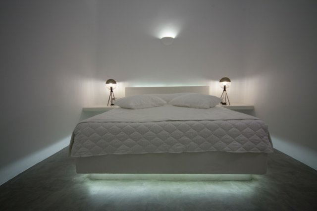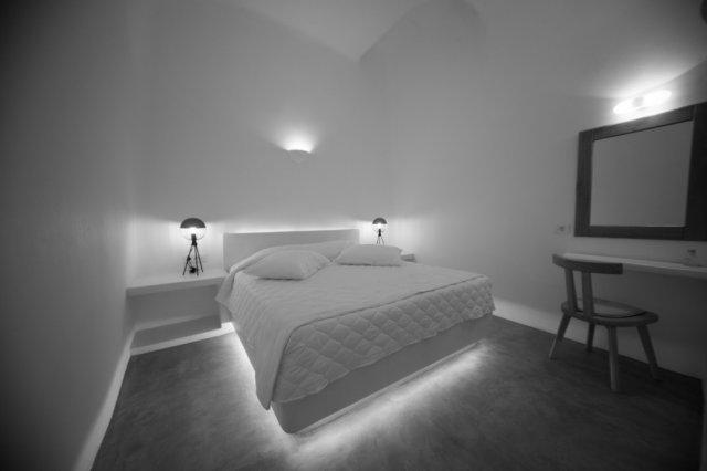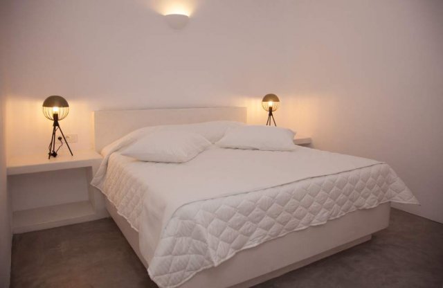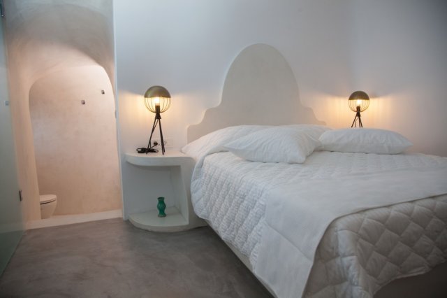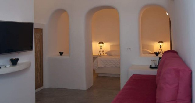 33,00 sq.m open plan style bedroom, offering a Queen Bed and a comfortable sofa, decorated in a minimalist Cycladic style. The quality furnishings and the stylish santorinian bathroom add a note of luxury to your stay. This suite boasts a balcony with private outdoor spacious jacuzzi, panoramic views of caldera, the perfect place to enjoy Santorini's world famous sunset.